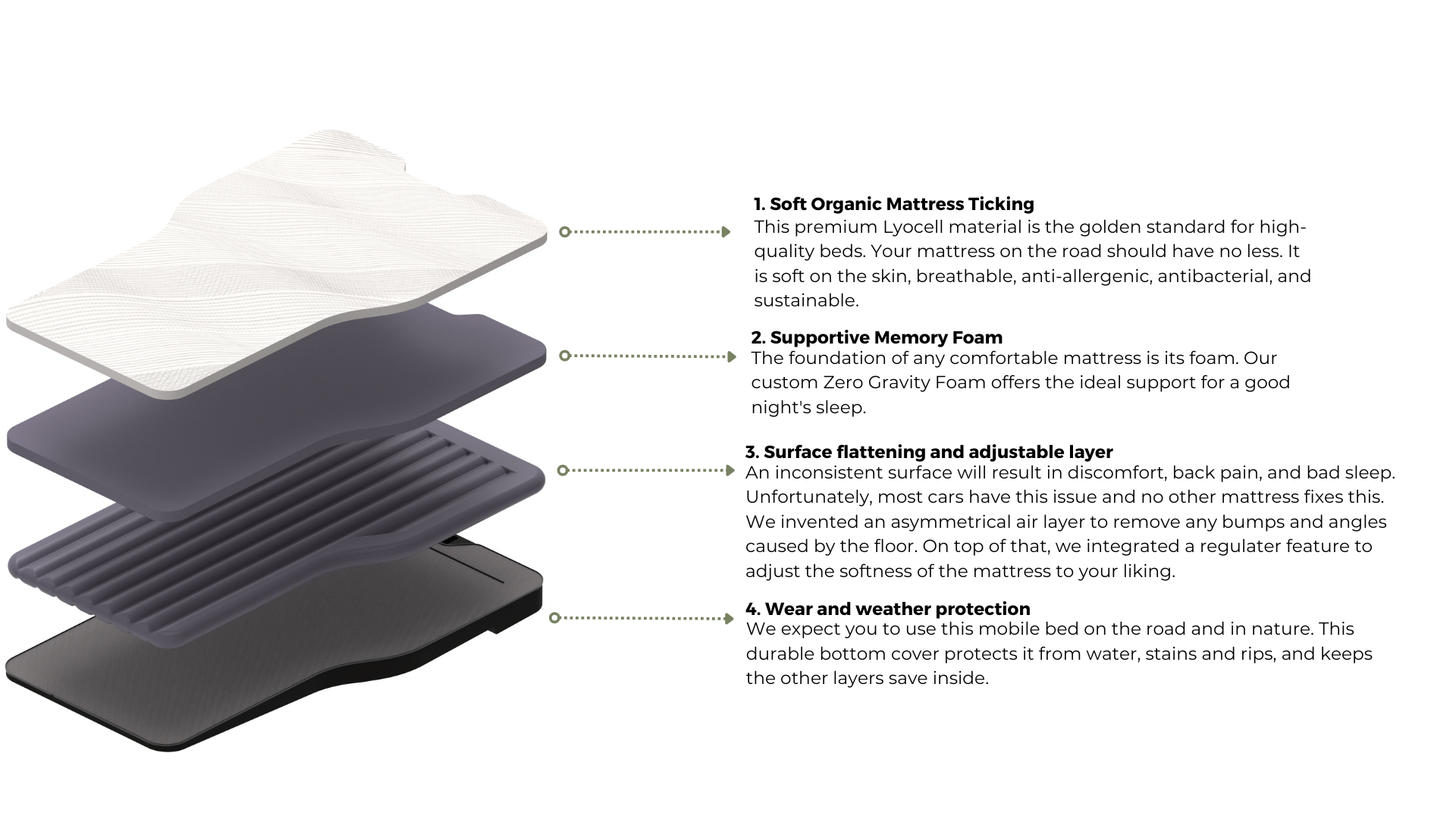 With our multi-layer system we achieved hotel-like comfort. Our organic top, foam and surface flattening layer make sleeping in a Tesla an experience like never before.